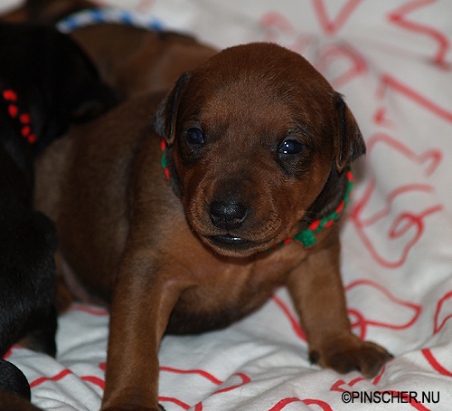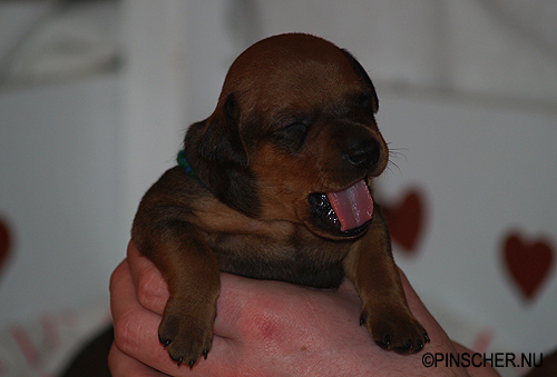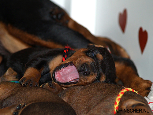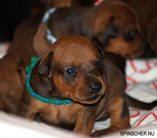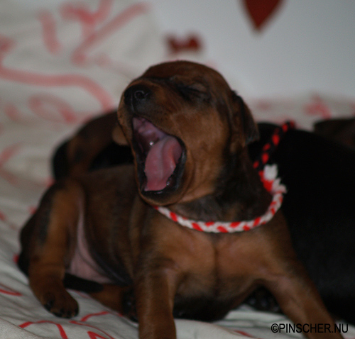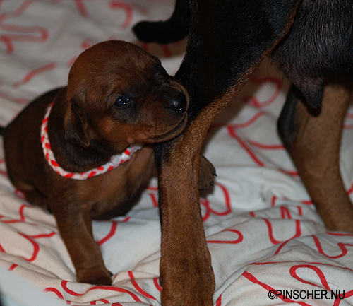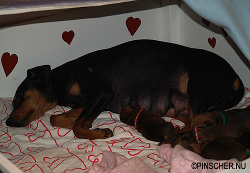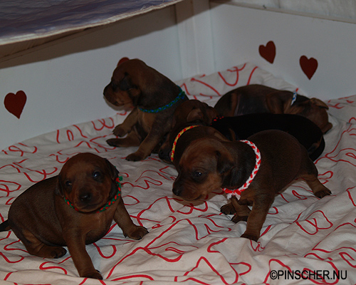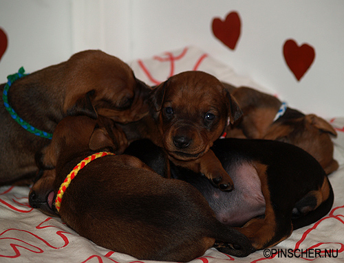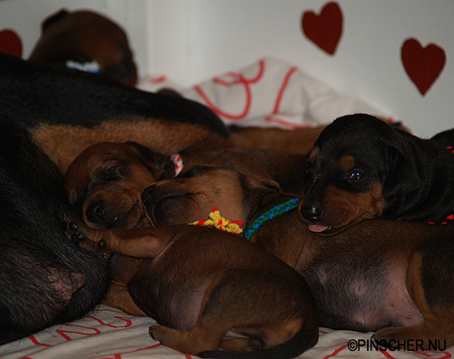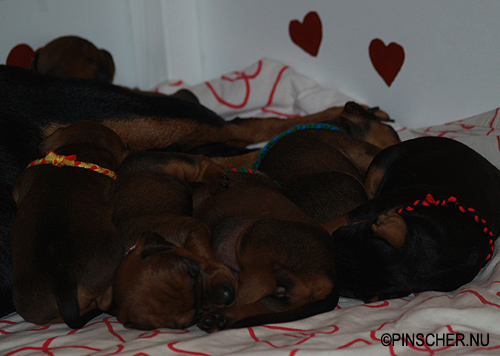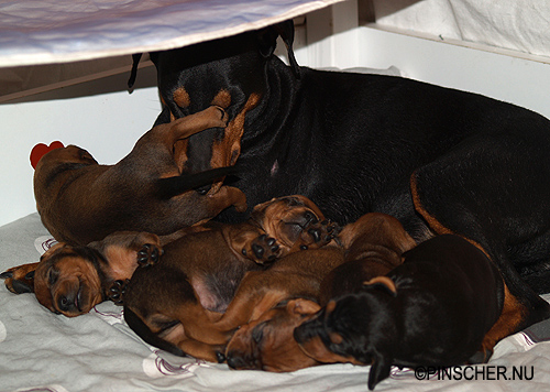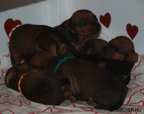 21 mars - 17 dygn Första gången valparna fotograferas med öppna ögon! Väldigt mörka bilder egentligen eftersom de är tagna på så långt avstånd, men slutresultatet är vi nöjda med! Alla har ökat i vikt och Bizkit har nu släppt in de andra hundarna i sovrummet. Glad påsk!