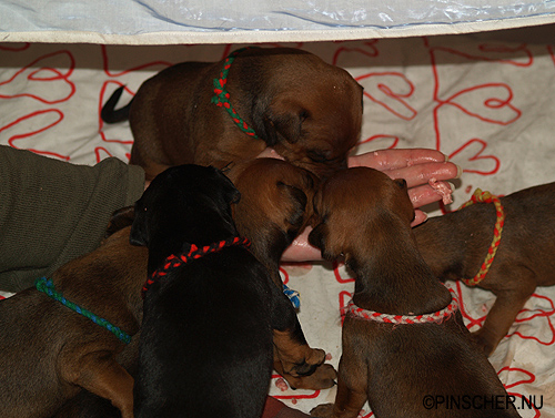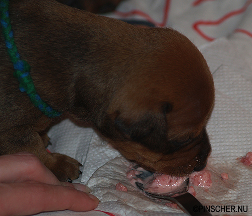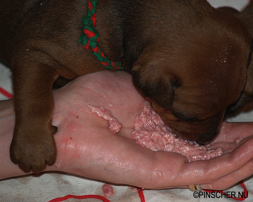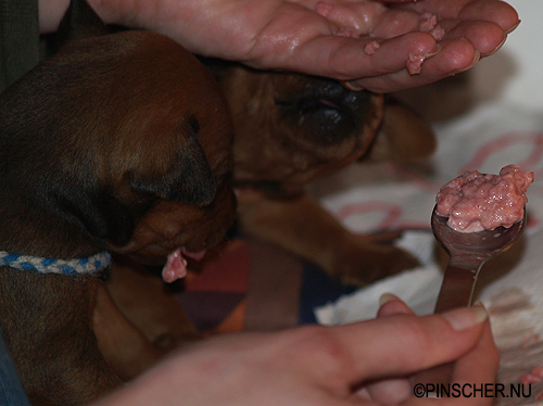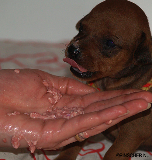 24 mars - 20 dygn Första gången valparna får smaka på något annat än mammas mjölk!