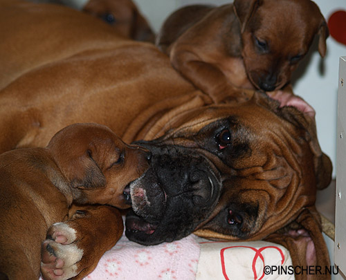 Bonsai, Bravo och Bonus 7 april - 34 dygn Boxi fostrar valparna på sitt smarta sätt - ignorans