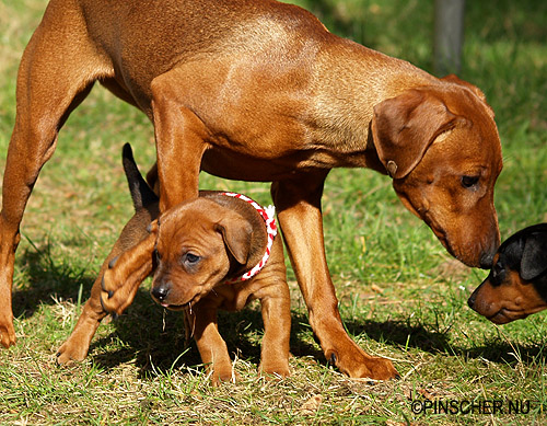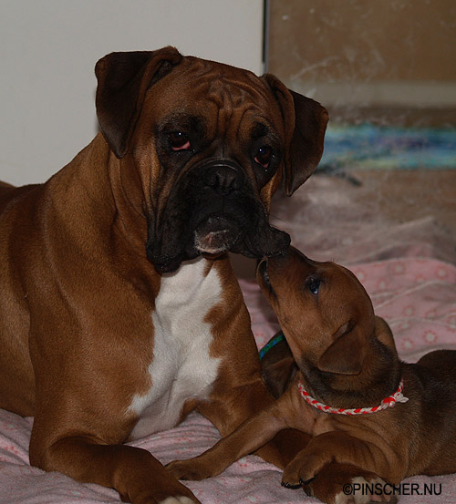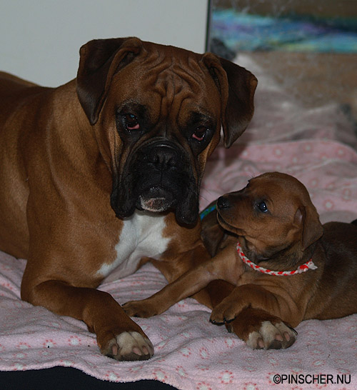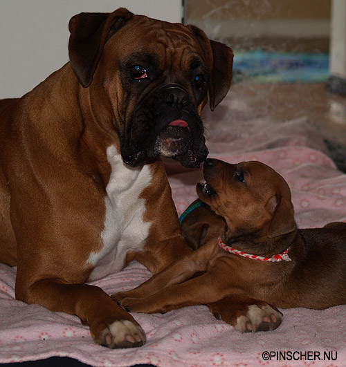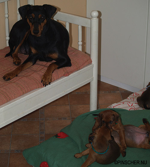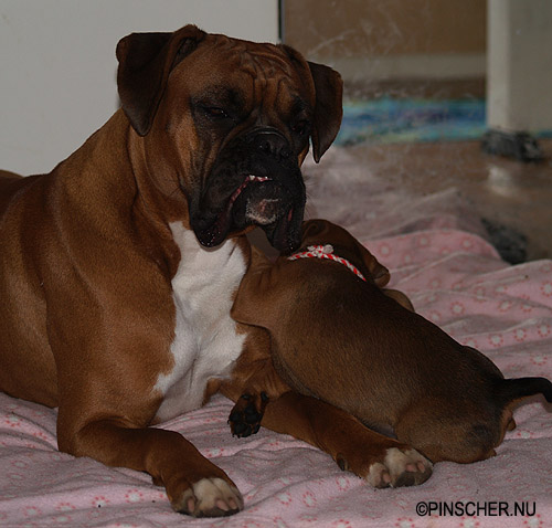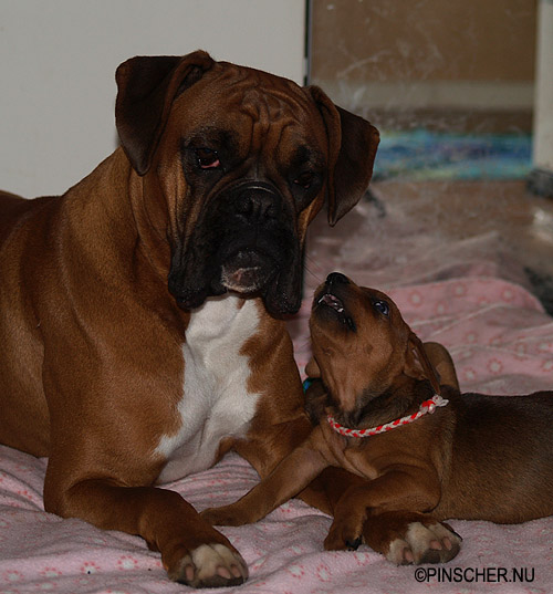 Bizkit håller koll på sina små på säkert avstånd från vassa valptänder 2 april - 29 dygn Om man är stor måste man vara snäll och det är Boxi