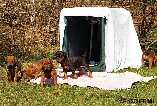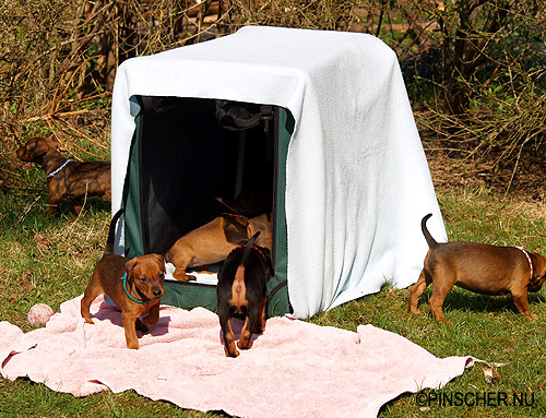 En stund i det fina vädret! Valparna älskar att vara ute, de har buren och mamma med som trygghet